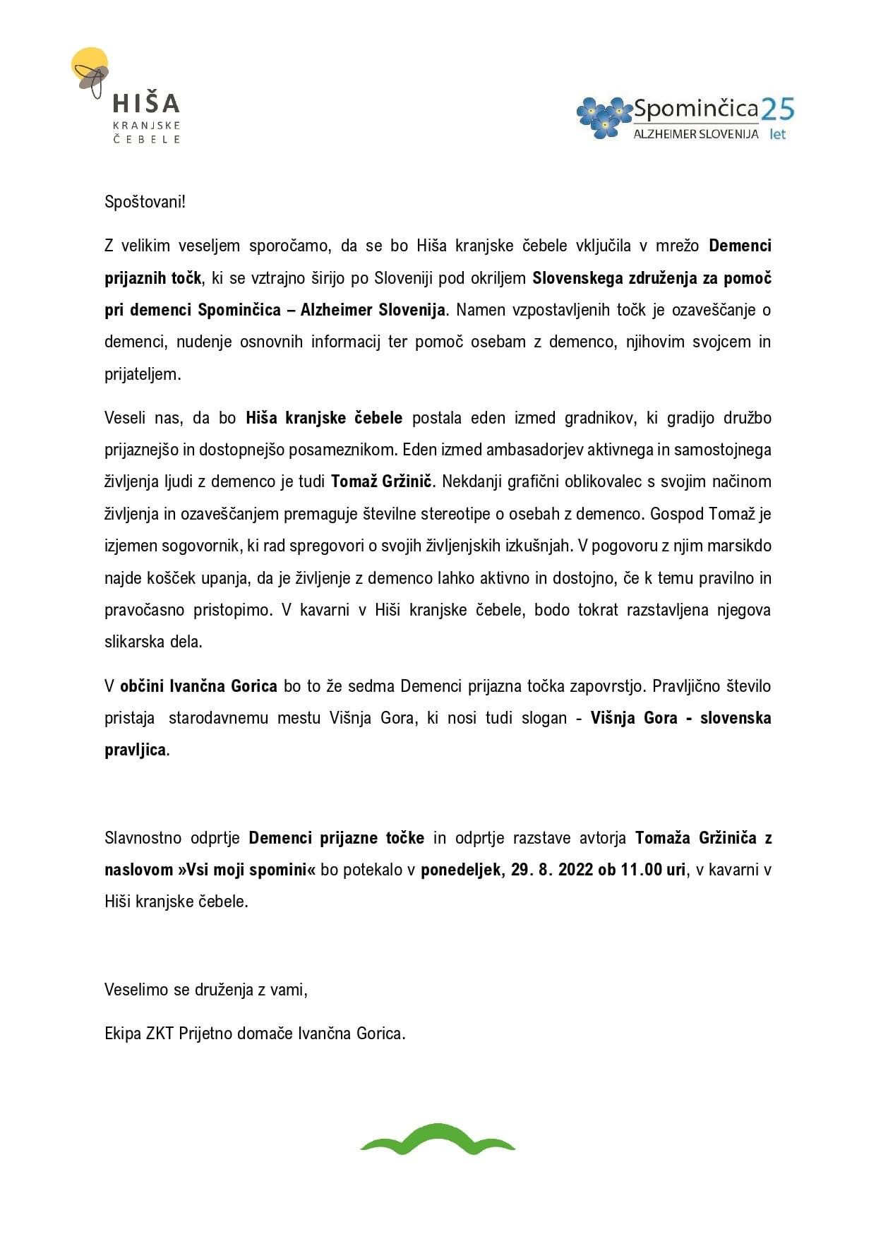 Kavarna v Hiši kranjske čebele vas z veseljem vabi na slavnostno odprtje Demenci prijazne točke in odprtje razstave avtorja Tomaža Gržiniča z naslovom “Vsi moji spomini” v ponedeljek, 29. 8. 2022 ob 11:00 uri.